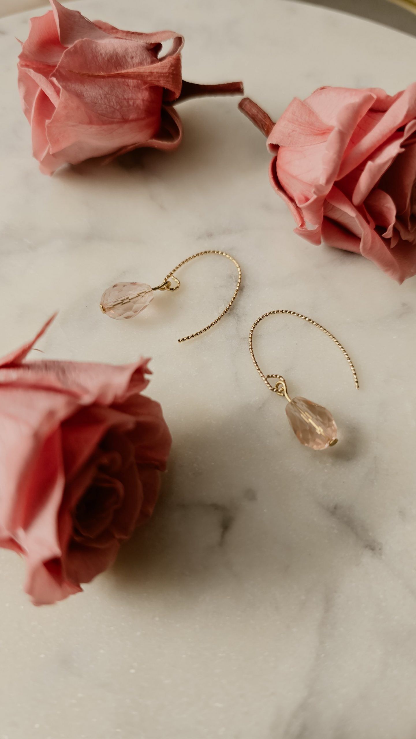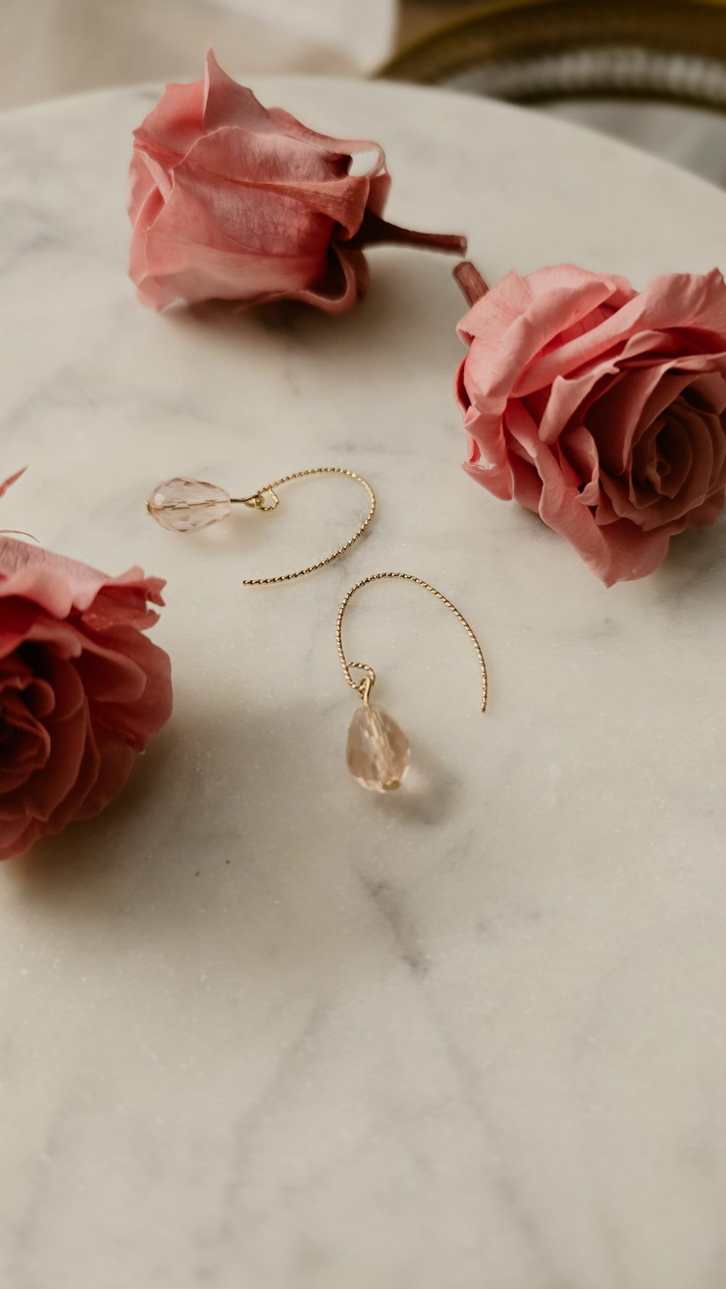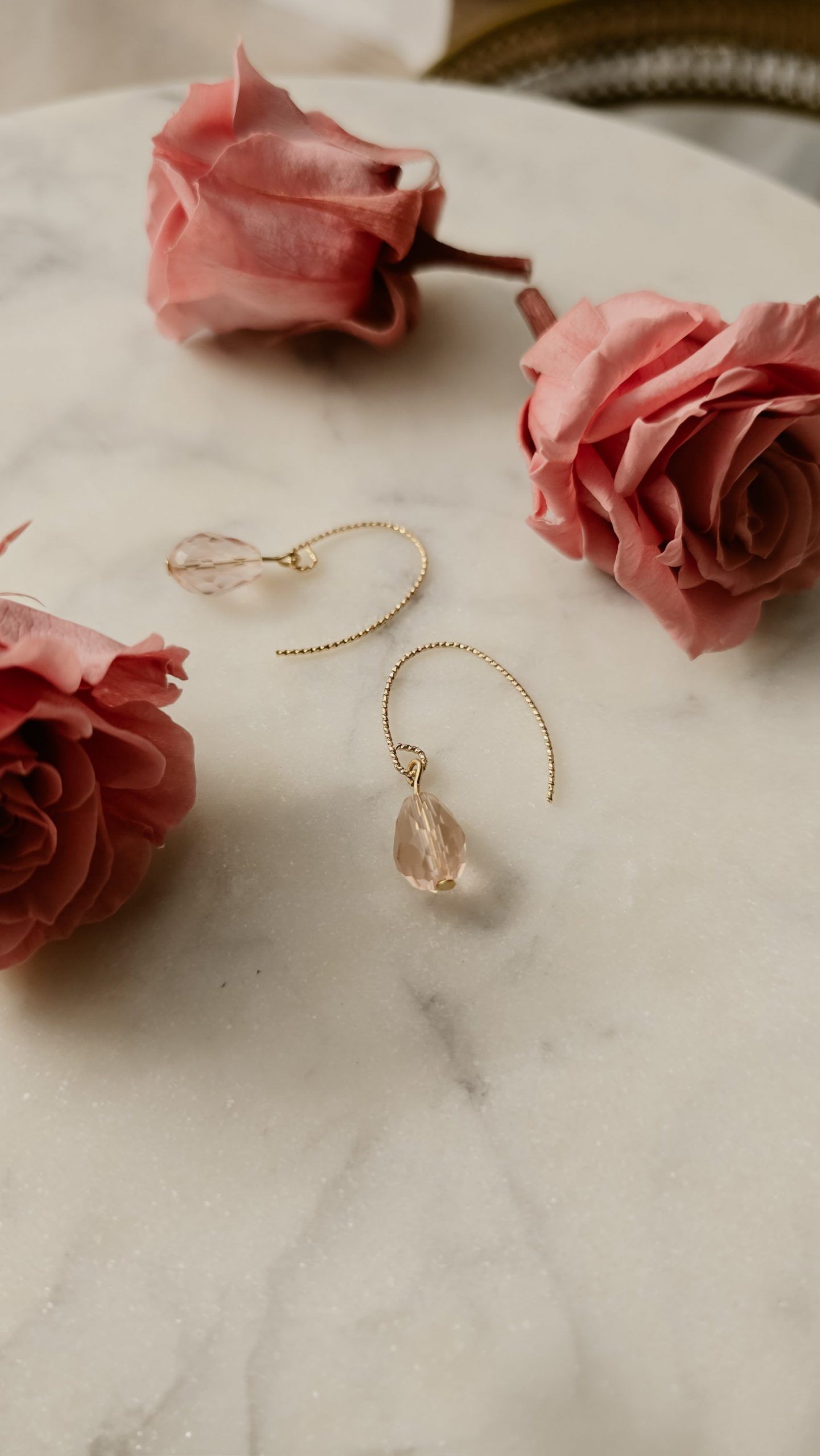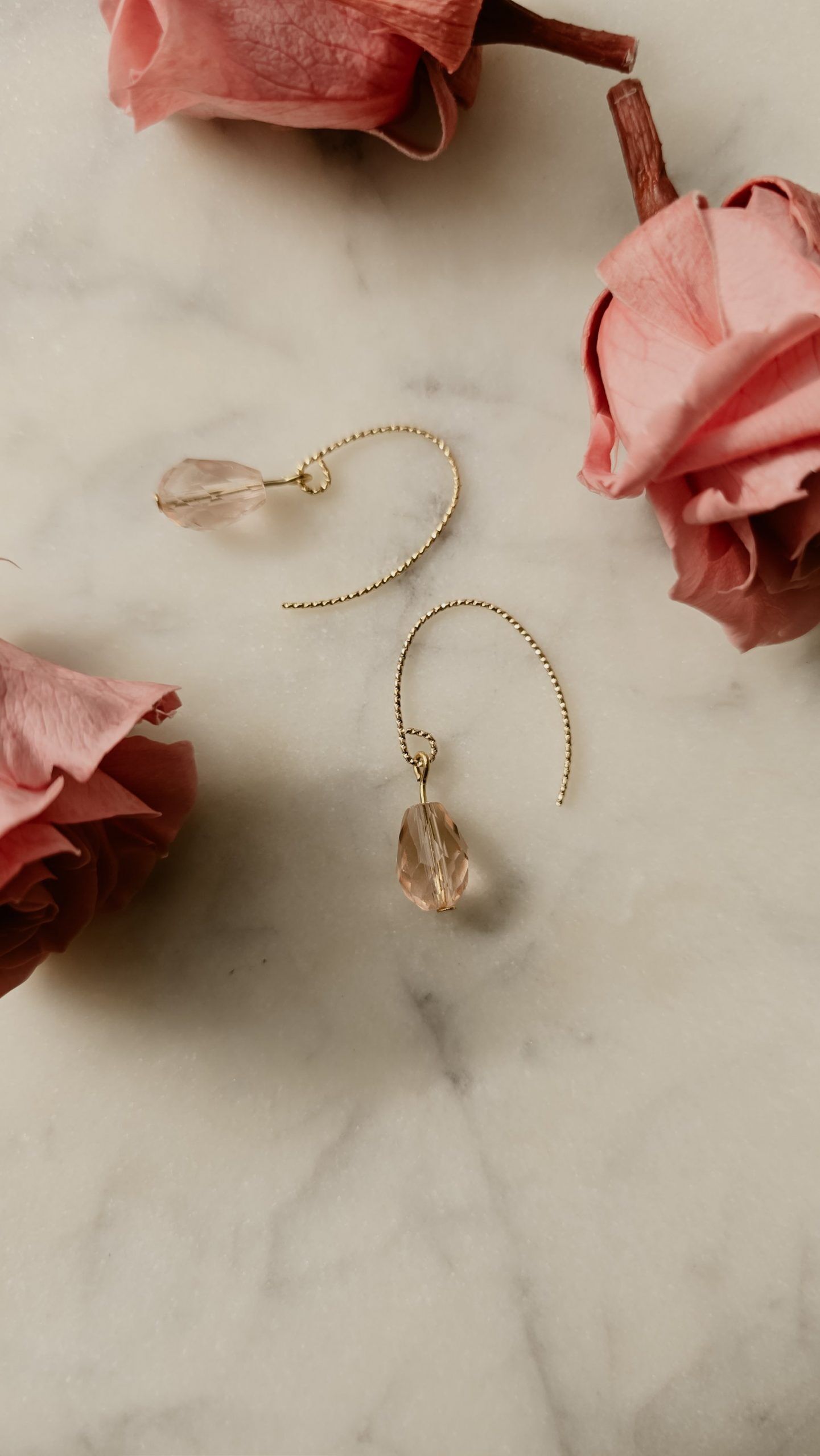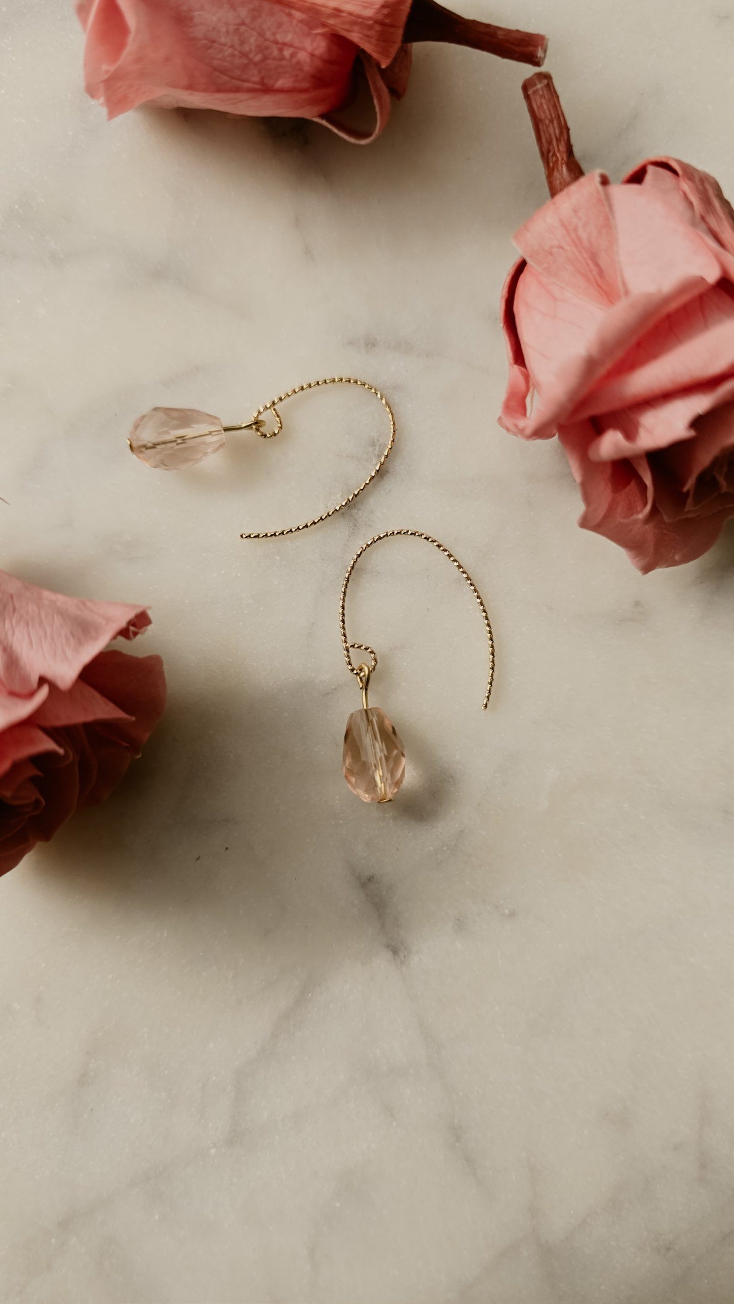 Entdecke die zeitlose Eleganz der Aurora Drops aus der exklusiven Rose Collection. Diese handgefertigten 18K vergoldeten Ohrringe vereinen edles Design mit romantischem Charme. Die sanft geschwungenen, vergoldeten Bügel halten eine tropfenförmig geschliffene Glasperle in zartem Rosé, die das Licht wunderschön reflektiert und deinem Look einen femininen Glanz verleiht.