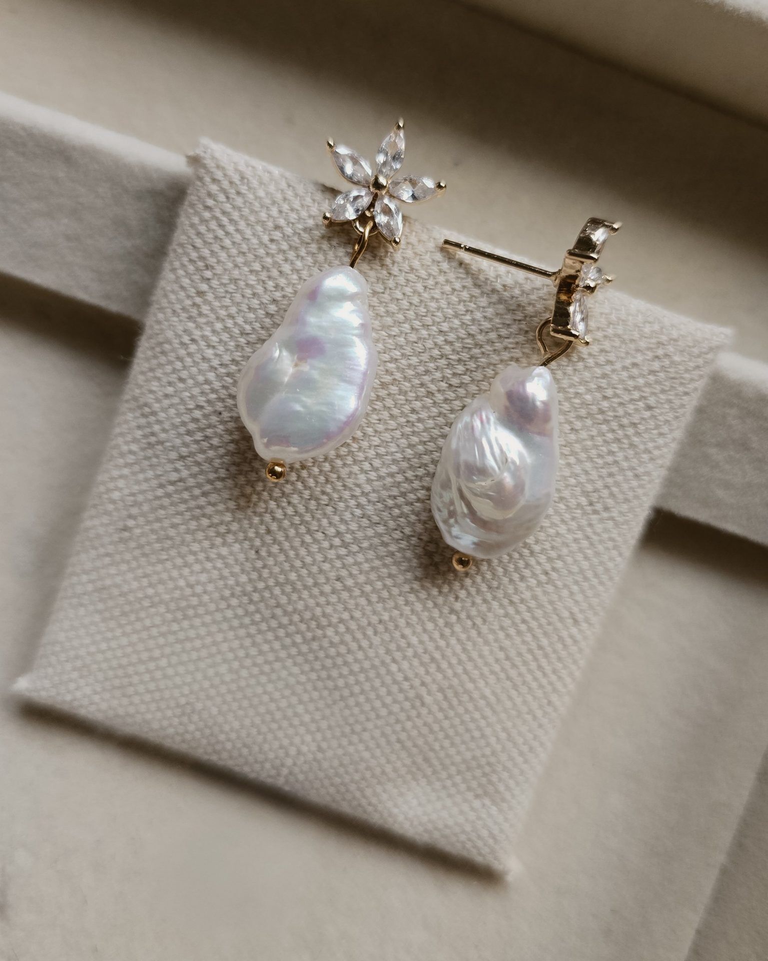 Die unregelmäßige Form der Perlen verleiht jedem Paar eine besondere Natürlichkeit, während die funkelnden Zirkonia-Steine das Licht edel reflektieren. Ein Schmuckstück, das feminine Raffinesse und modernen Minimalismus vereint.