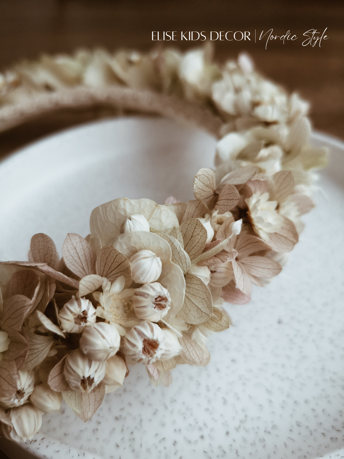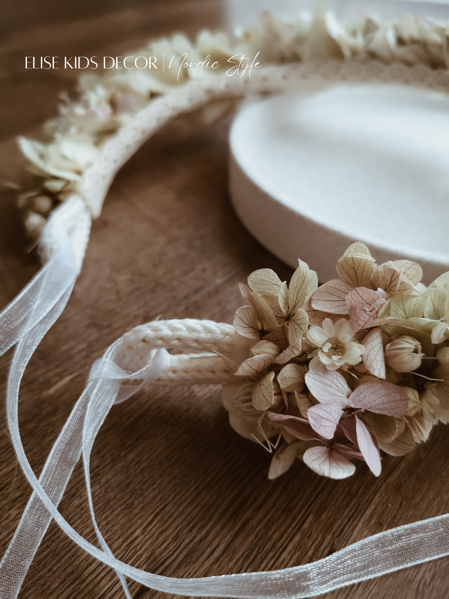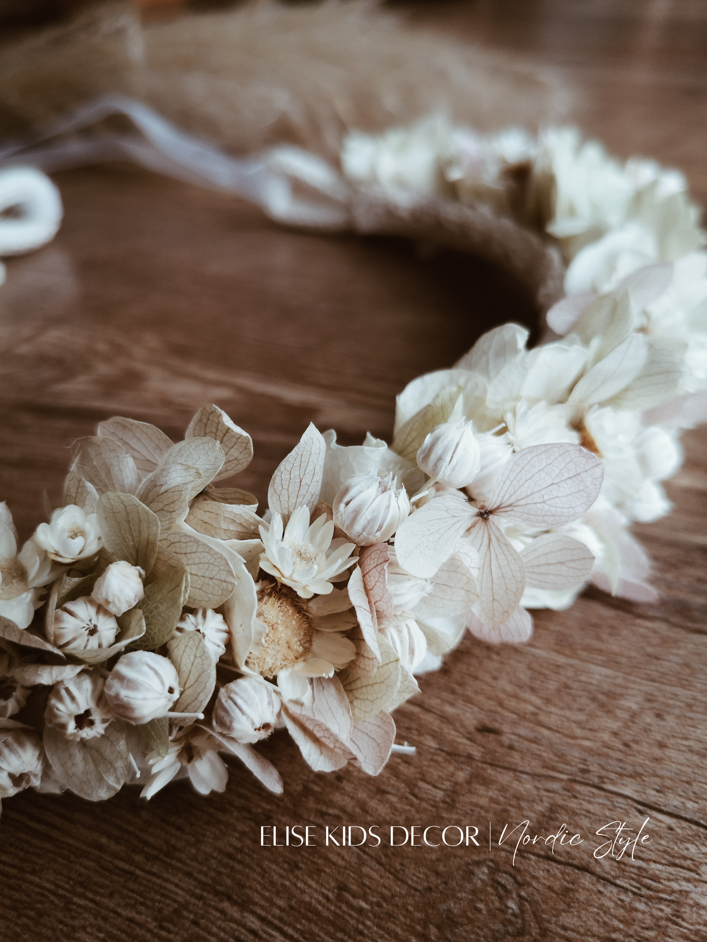 Tauche ein in die Welt zeitloser Eleganz und romantischer Schönheit mit unserem exquisiten handgefertigten Haarkranz aus edlen Trockenblumen, der speziell für besondere Anlässe wie Hochzeiten, Taufen, Firmungen und andere feierliche Ereignisse geschaffen wurde. Dieser zauberhafte Haarschmuck vereint die natürliche Pracht von stabilisierten Hortensien, zarten Trockenblumen, die für ihre unvergleichliche Schönheit und Langlebigkeit bekannt sind.