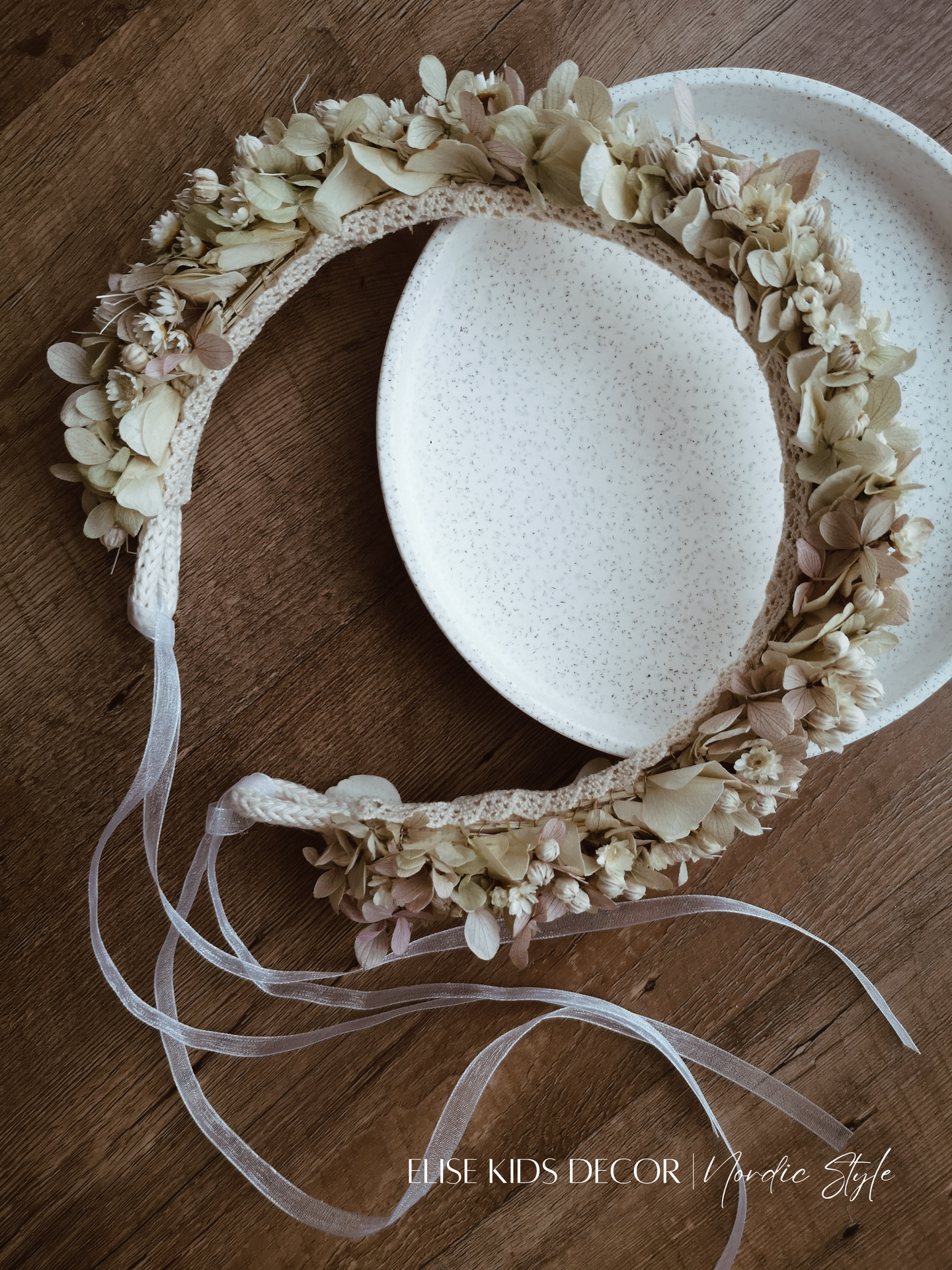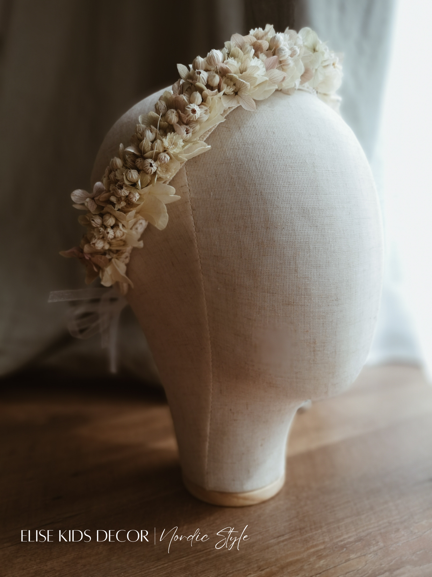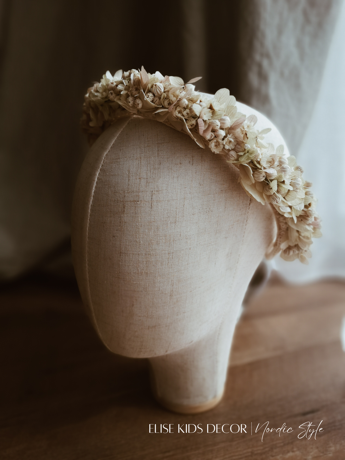 Tauche ein in die Welt zeitloser Eleganz und romantischer Schönheit mit unserem exquisiten handgefertigten Haarkranz aus edlen Trockenblumen, der speziell für besondere Anlässe wie Hochzeiten, Taufen, Firmungen und andere feierliche Ereignisse geschaffen wurde. Dieser zauberhafte Haarschmuck vereint die natürliche Pracht von stabilisierten Hortensien, zarten Trockenblumen, die für ihre unvergleichliche Schönheit und Langlebigkeit bekannt sind.