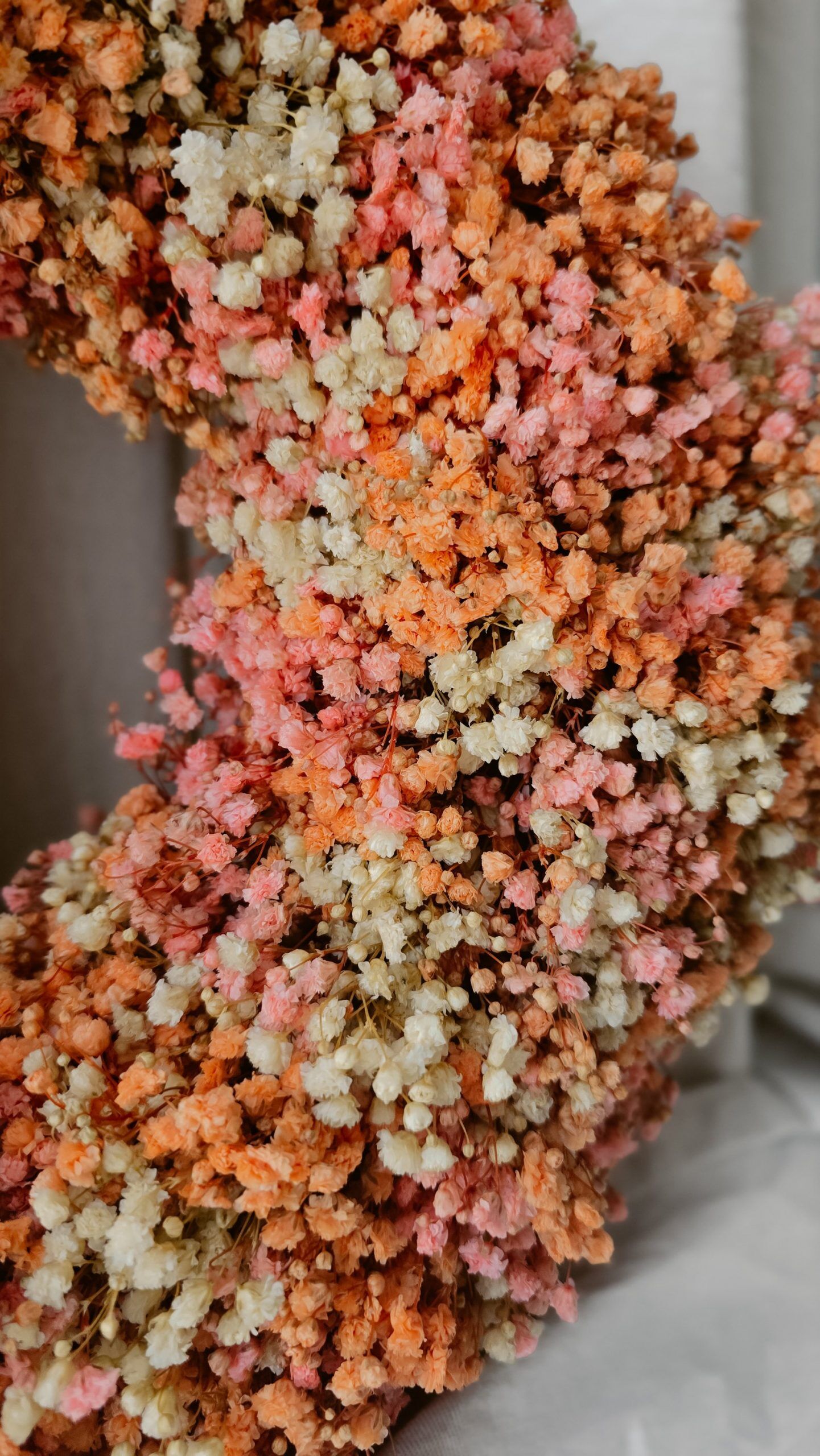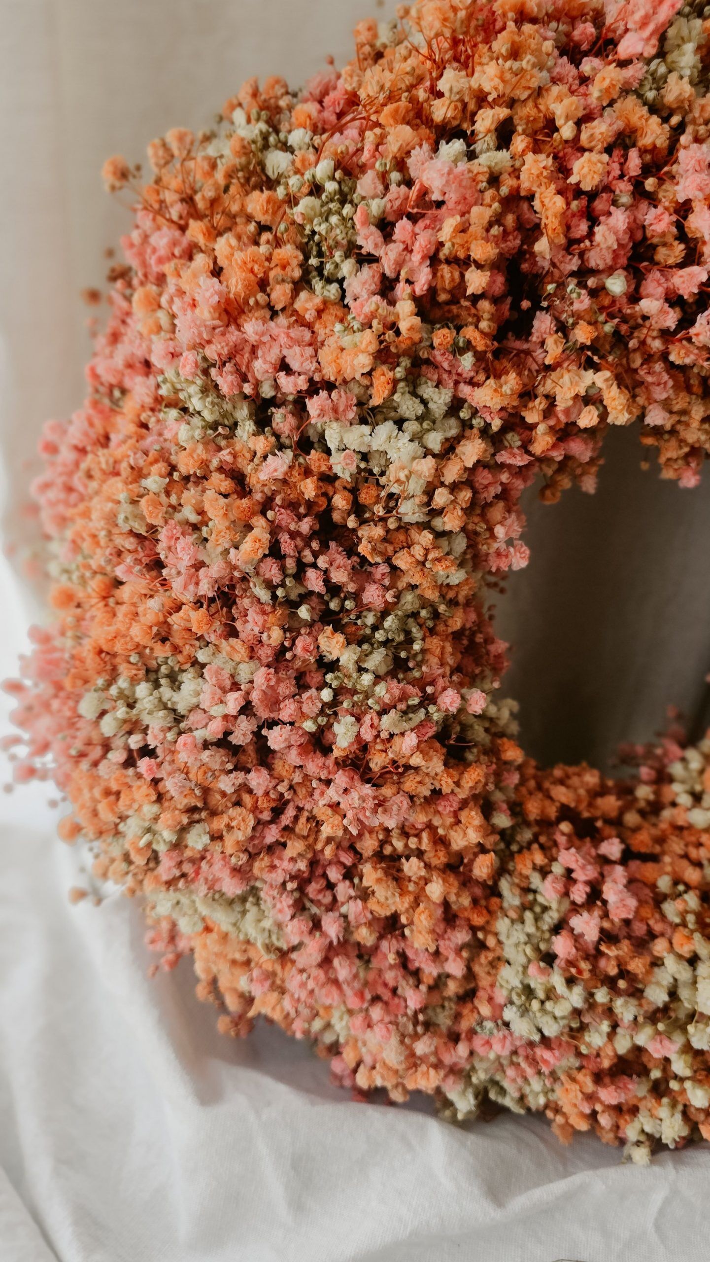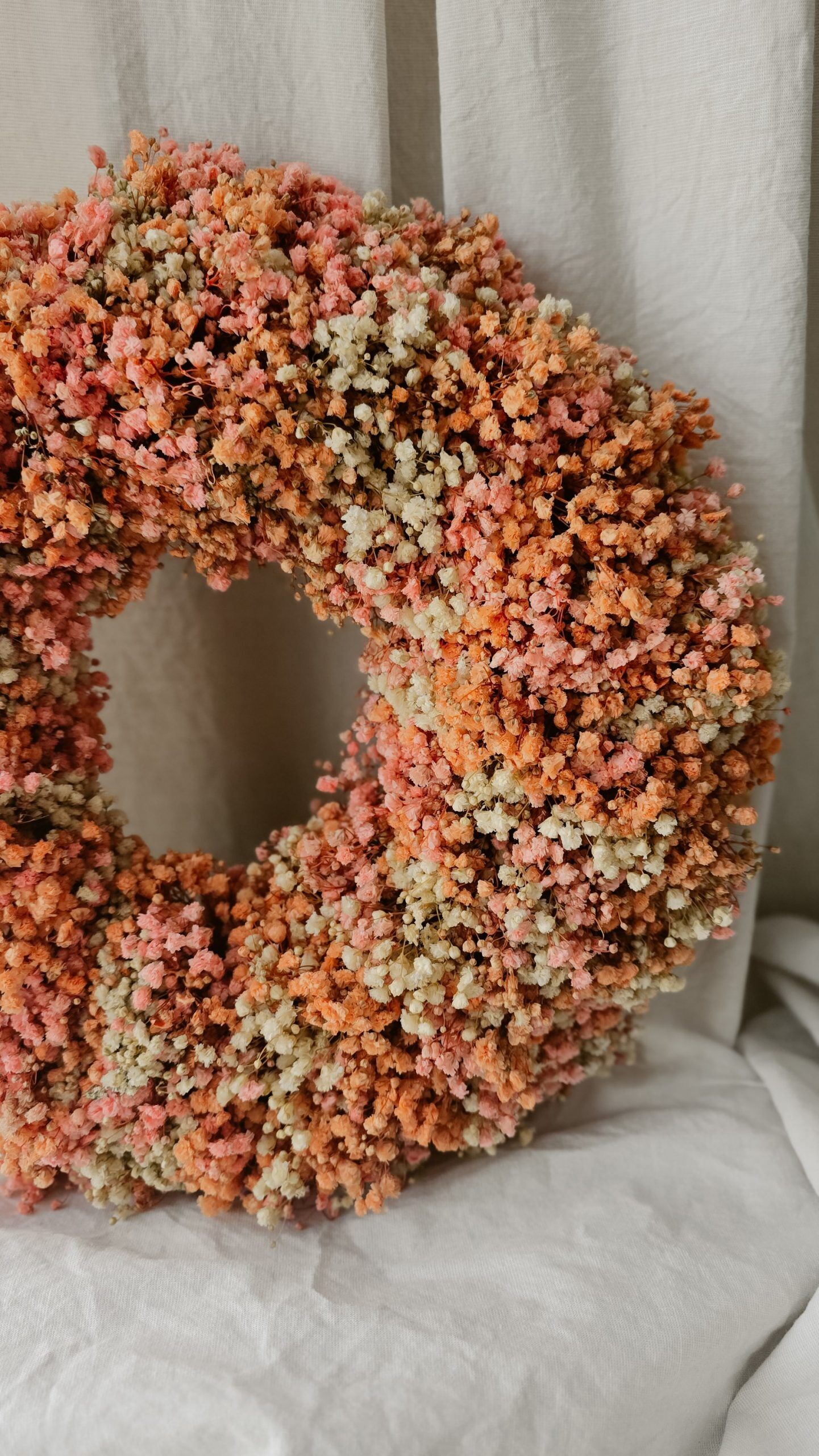 Handgefertigter Kranz aus stabilisiertem Schleierkraut in Rosa, Orange und Weiß. Perfekt als Türkranz, Wanddeko oder Tischschmuck. Langlebig, nachhaltig und pflegeleicht – ein zeitloser Hingucker für dein Zuhause oder besondere Anlässe! 💐