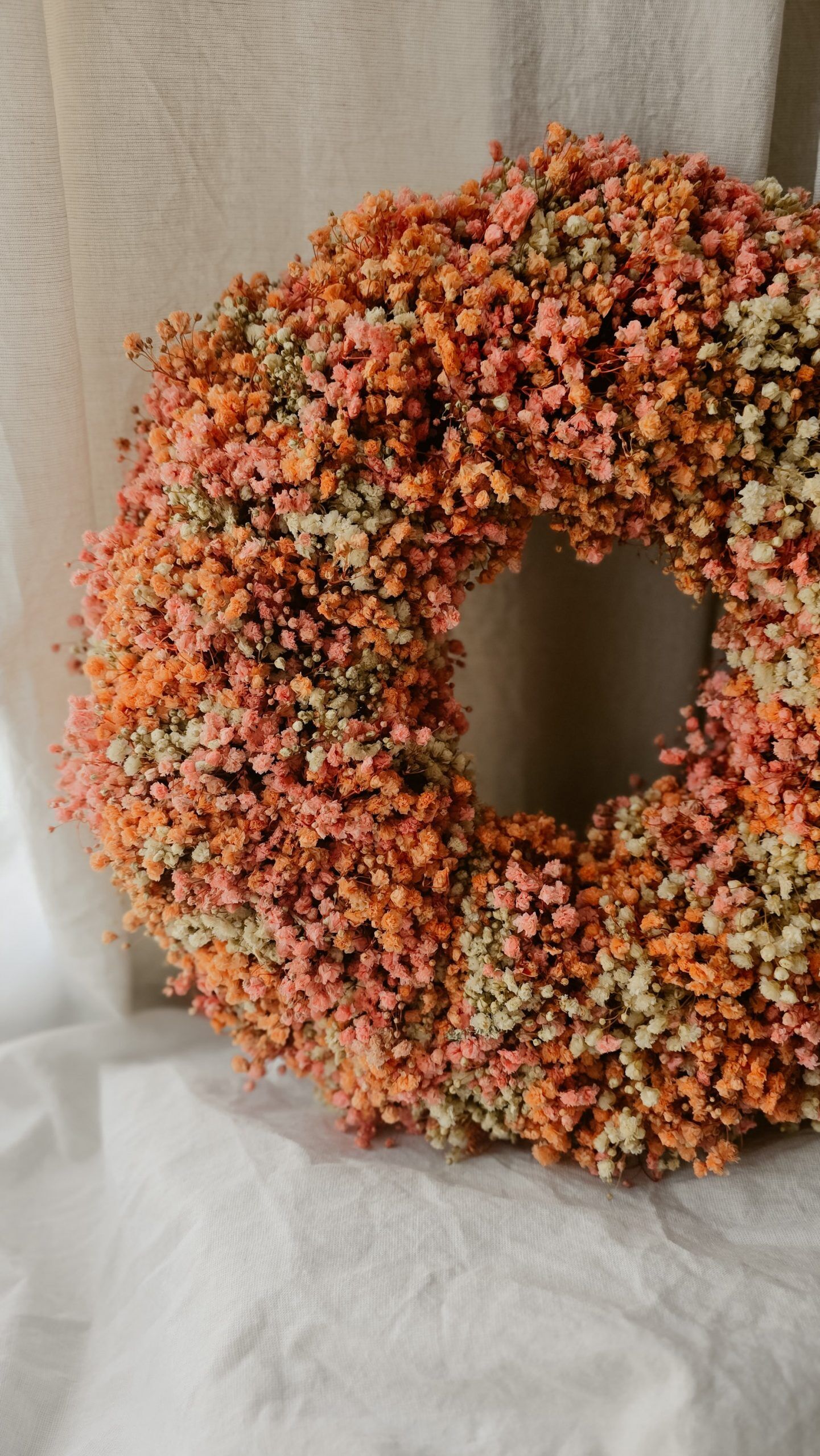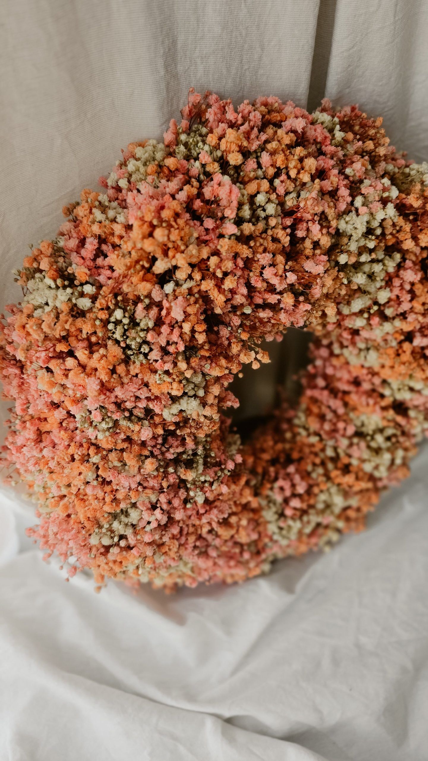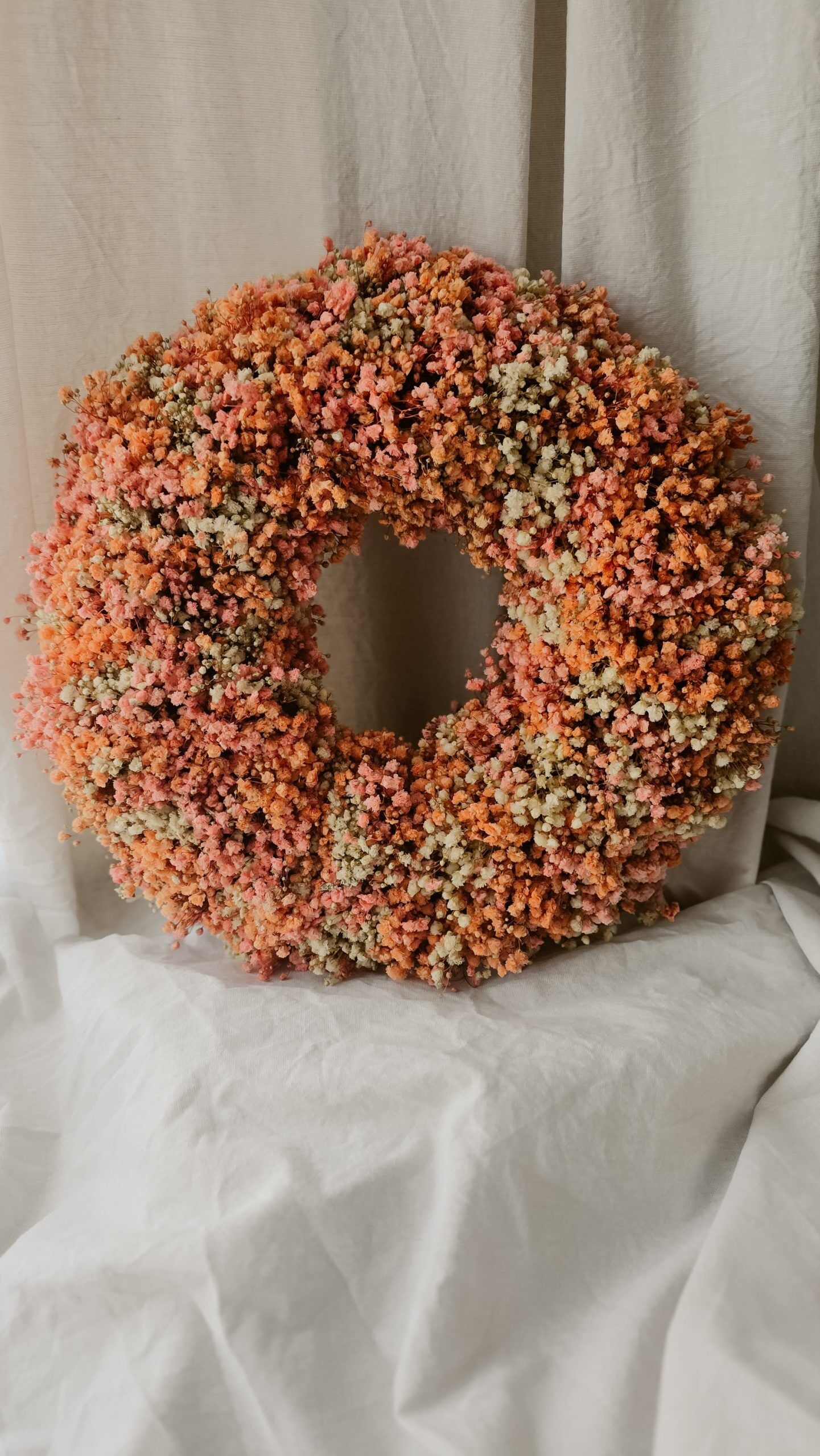 Handgefertigter Kranz aus stabilisiertem Schleierkraut in Rosa, Orange und Weiß. Perfekt als Türkranz, Wanddeko oder Tischschmuck. Langlebig, nachhaltig und pflegeleicht – ein zeitloser Hingucker für dein Zuhause oder besondere Anlässe! 💐