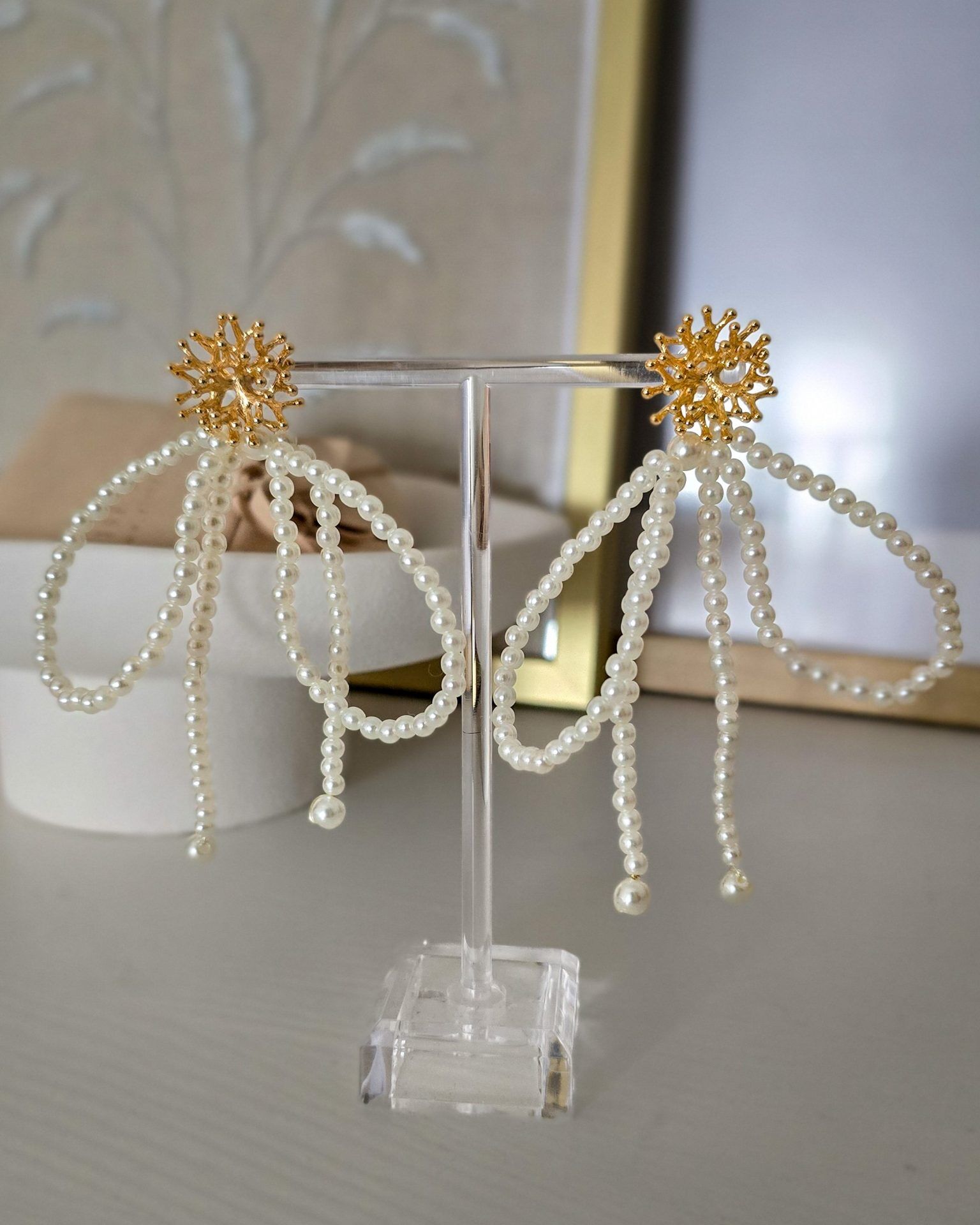 Die Basis ist 18K vergoldet, veredelt mit hochwertigen Kunstperlen, die im Licht schimmern wie echte. Trotz ihrer beeindruckenden Optik sind die Sofia Ohrringe federleicht und den ganzen Tag über angenehm zu tragen – perfekt für festliche Anlässe, Hochzeiten oder einen eleganten Abendlook.
