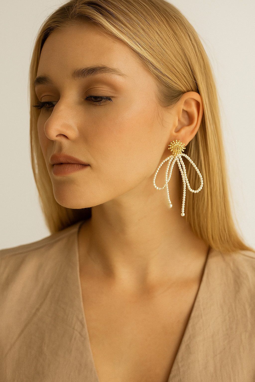 Kombiniere Sofia mit einem eleganten Dutt oder sanften Wellen – der zarte Perlenglanz lässt dein Gesicht erstrahlen und verleiht jedem Look einen Hauch Luxus.